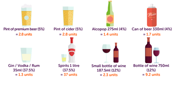 As alcoholic drinks are of different strengths and sizes, it can be hard to work out how much you are drinking. To help with this we think of the alcohol content of drinks in ‘units’. The number of units in some popular drinks is shown below.